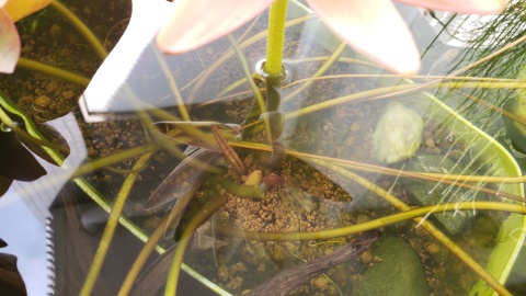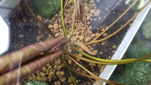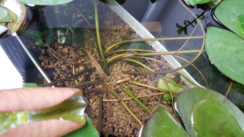 睡蓮内鉢の向きを180℃変更し株元(成長点)が手前に来るようにした。