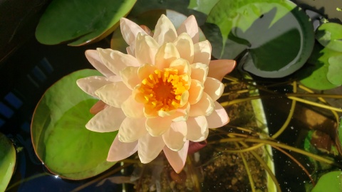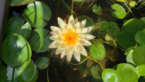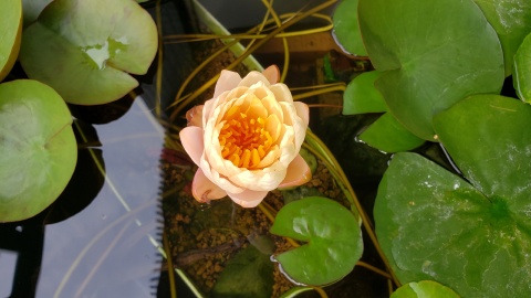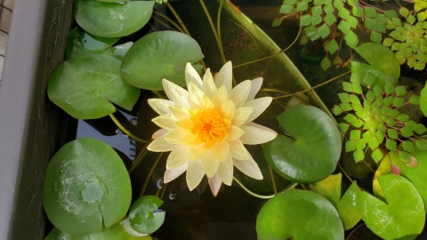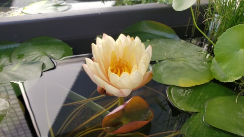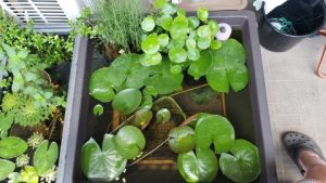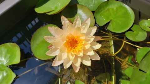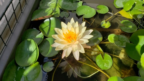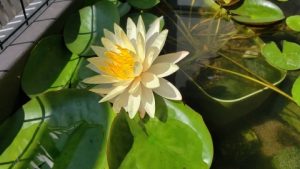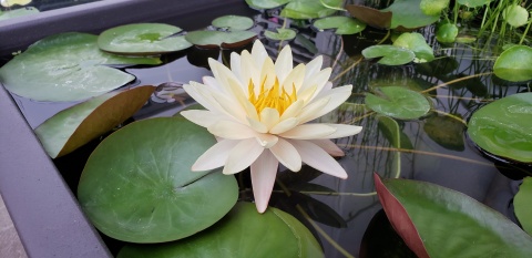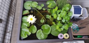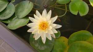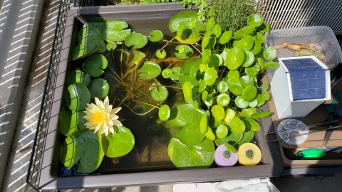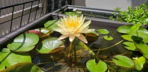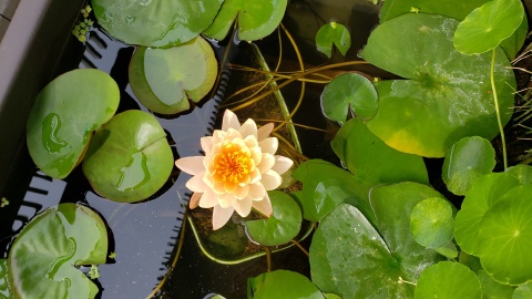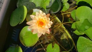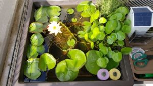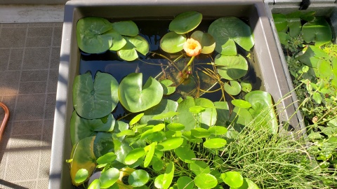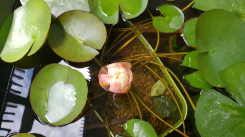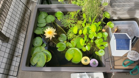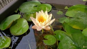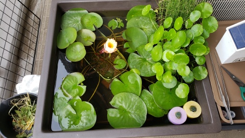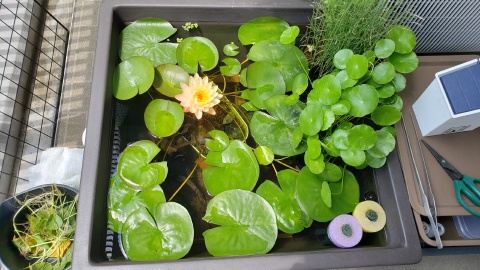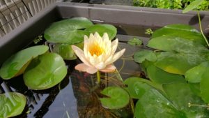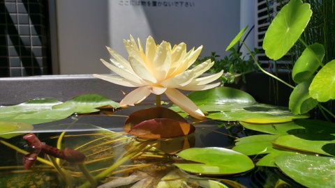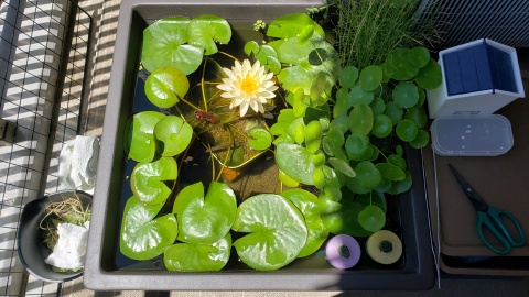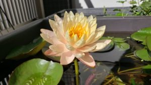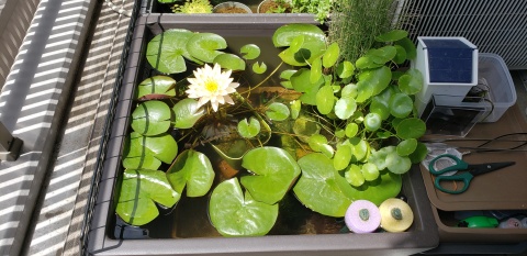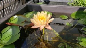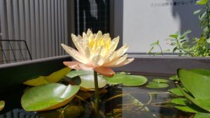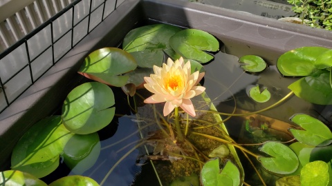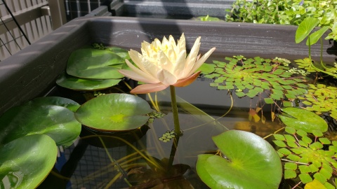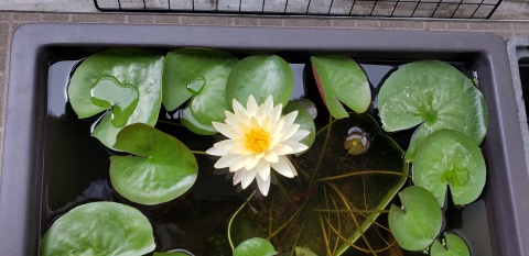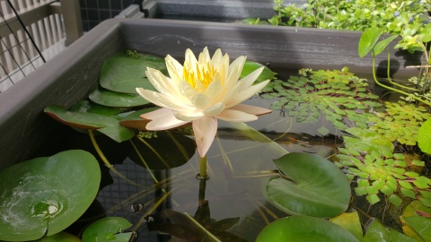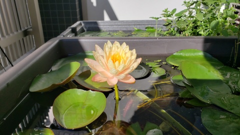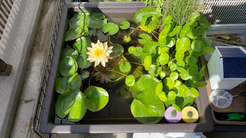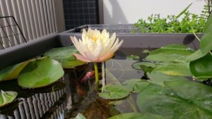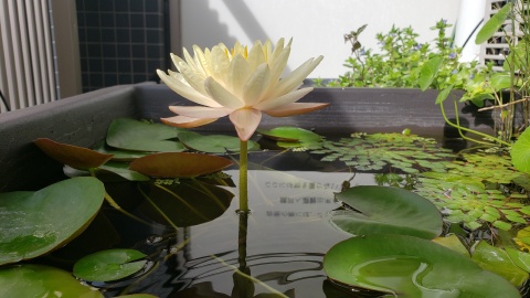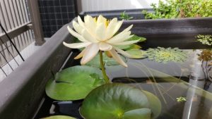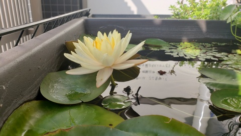 2023年4月13日に植付した耐寒性睡蓮(温帯睡蓮)“マンカラウボン”の初開花は2023年7月31日、初開花迄に要した日数は106日。庭先ビオトープの初開花迄の日数71~87日に比べると開花に要した時間が長い。理由は「購入時の株が小さかったこと」「日照時間が短かったこと」の2つと思われる。また、二輪咲が見られなかった理由としては「内鉢が小さかったこと」と考えられる。1つの蕾は朝7時~11時半頃に掛けて3日間咲き、4日目は咲かない。“マンカラウボン”葉も花も中型サイズでベランダビオトープでも開花に至ることが出来き、花上りは上々の品種と言える。