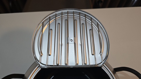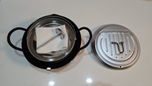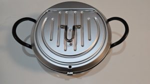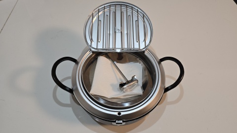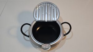 蓋を開くと裏側に油切網が付いている。満水容量が2.2Lなので約半分程に1Lの油を入れる感じになる。油はキャノーラ油を使用する予定。