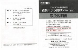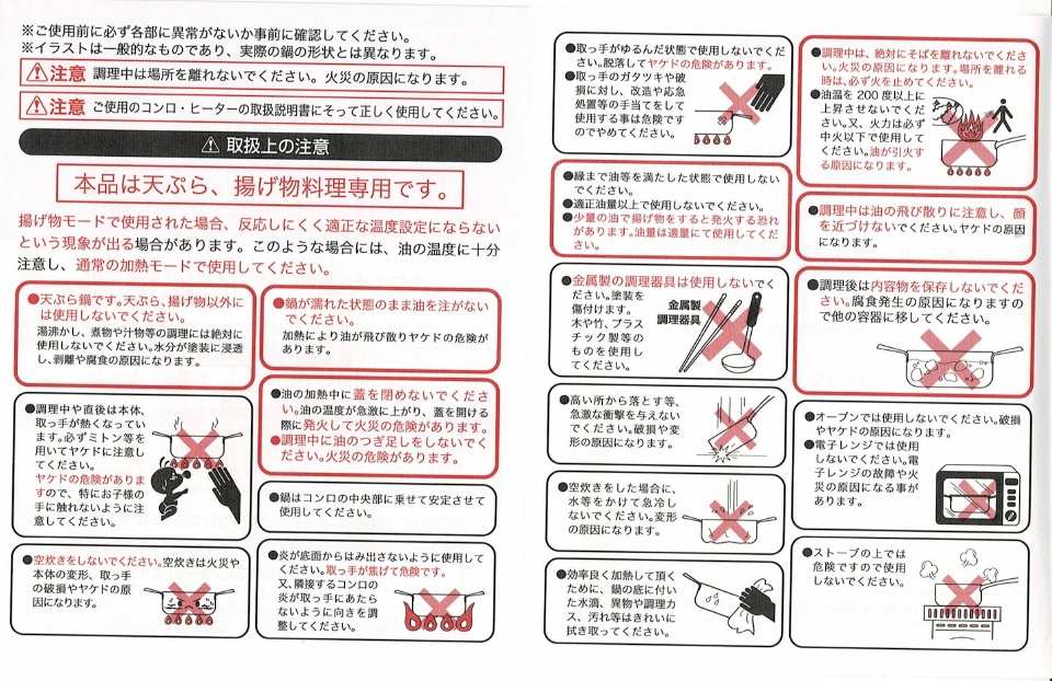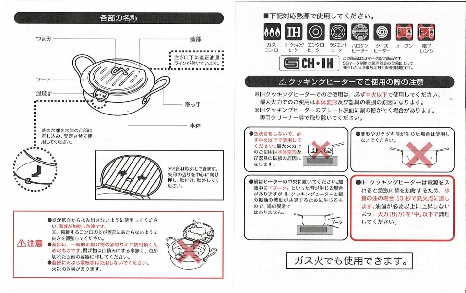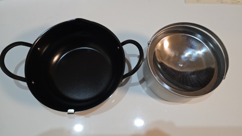 製品HPから引用した仕様がコチラ。適正油量約1L、重量1.3kgとやや重いが、油跳ねを抑えるための蓋且つ蓋裏に油切網があるためアウトドア揚げ物レシピのクッカーとしては使いやすそうな印象。天ぷら鍋となっているが揚げ物全般に使用可能。温度計もデフォルトで付属しているのも嬉しい。