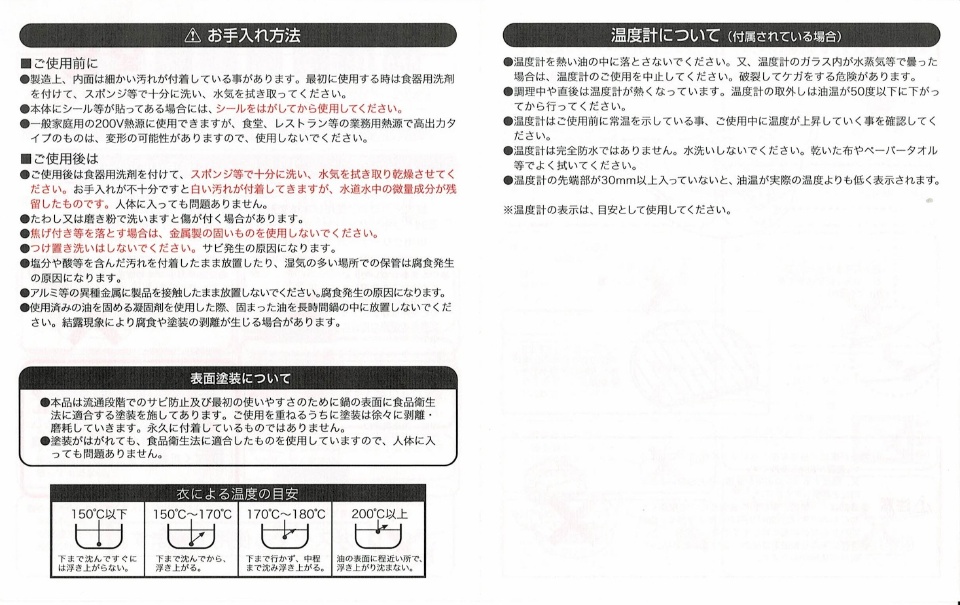 ※流通段階でのサビ防止・最初の使いやすさのために鍋の表面に食品衛生法に適合する塗装を施してあります。ご使用を重ねるうちに塗装は徐々に剥離・磨耗していきます。永久に付着しているものではありません。塗装が剥がれても食品衛生法に適合したものを使用していますので、人体に入っても問題ありません。