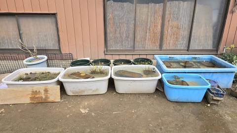 庭先北側エリアには5つの水槽を配置。写真左からナンバリング。