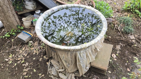 昔使っていた穴の開いたゴエモン風呂を父親がビニールを使って復活。