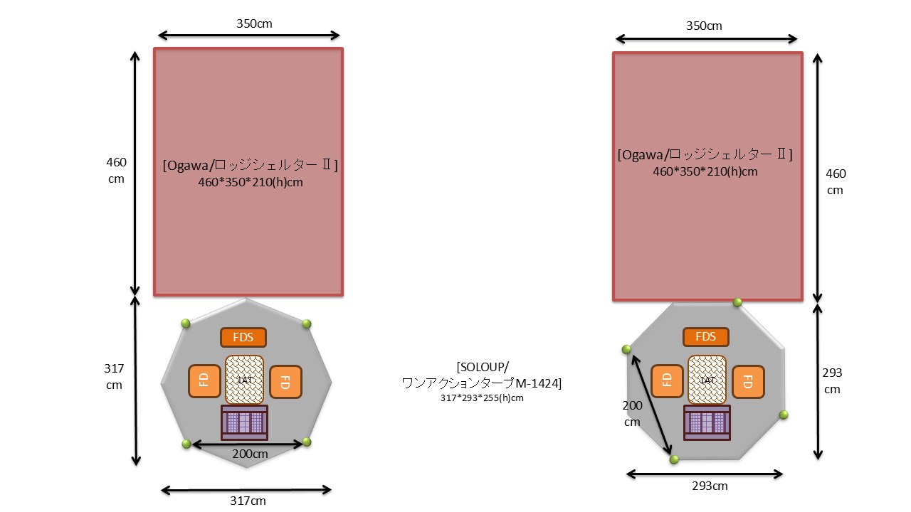[SOLO UP/ワンアクションタープM-1424]の天幕は八角形、脚部は四角形となっている。脚部をロッジシェルターⅡの長辺側と並行にレイアウト(左)と天幕辺を並行にレイアウト(右)する2パターンあり。張り網やサイドウォールの装着位置にもよるがロッジシェルターⅡの長辺側入口のアクセスを考えるとイメージ左の方が使い勝手良いかな。
