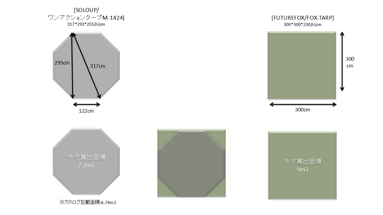 組立式の[FUTUREFOX/FOX-TARP]の方が約3kg軽く、タープ下スペースも若干広い。スクエアボトムの方が[Ogawa/ロッジシェルターⅡ]と併せやすい。