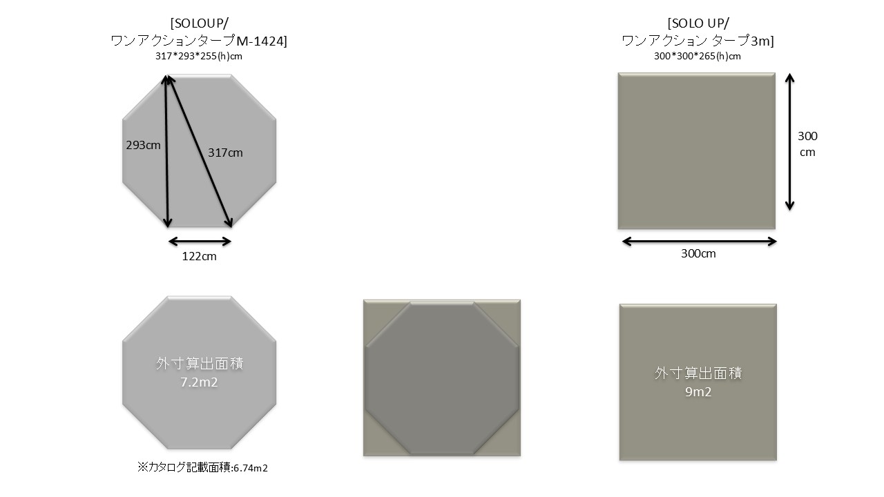 ワンタッチタイプのセンターロックタイプの[SOLO UP/ワンアクション タープ3m]の方が約4.5kg軽く、タープ下スペースも若干広いが屋根フレームの強度はオクタタイプに比べ低いと思われる。天幕がスクエアの方が[Ogawa/ロッジシェルターⅡ]と併せやすいかな。天幕シートの面積はほぼ同じだが、[SOLO UP/ワンアクションタープM-1424]の脚部間長は200cmに対し、[SOLO UP/ワンアクション タープ3m]は300cmでサイズ感は若干大きく感じるかもしれない。