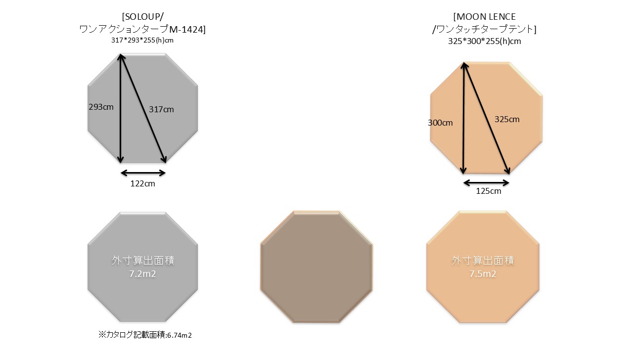 両幕共、天幕の形状がオクタゴン(八角形)且つセンターロック式のワンタッチタイプの自立式タープ。[MOONLENCE/ワンタッチタープテント]は[SOLO UP/ワンタッチタープテント]より若干大きめで遮光性は低いが収納時の全幅が89cmと短いのが利点。