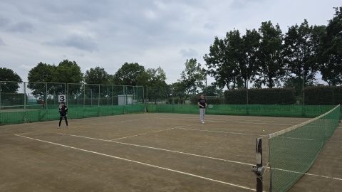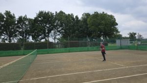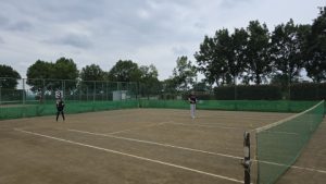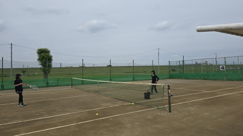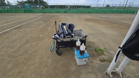 マイラケはコントロール系の黄金スペックラケット[YONEX/PERCEPT100 G3]にスピン系のポリガット[YONNEX/ポリツアーレブ1.25mm]を少し緩めの48Pで張り上げ。張りたて時に比べガットがやや緩み馴染んできたことと、冬に比べて気温が高いことも相まってほどほど良く飛びボレーもストロークも打ちやすかった。