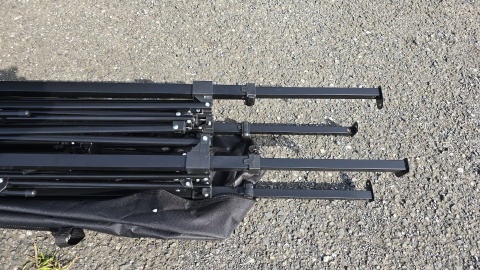収納袋から脚フレームを取り出し、天幕シート下からのセンターロック作業をし易くするために予め脚を下段位の高さに1段階伸ばしておく。2人作業ならこの段階で2段階伸ばして置いても良いかもしれない。