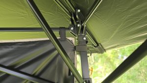 天幕シート下に入り、センターロックを垂直に持ち上げフレームをロックする。傘を開くように自立式タープが連動しセットされる!