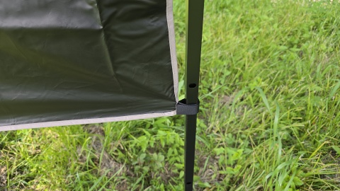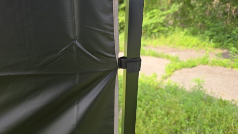 サイドウォールのカタログ記載のサイズは200*145cm で本体への装着は全てマジックテープ。上辺端は2ヵ所、側面と下辺は1ヵ所ずつ計8カ所のマジックテープ。フック式ではないので強風時に外れるリスクは拭えない。また、ハトメが付いていないので張り網経由でハの字型に広げて設置することはできない。天幕シートと同じくブラックコーティングをされているため遮光性は高いが暗色なのでその分タープ下が少し暗くなる。