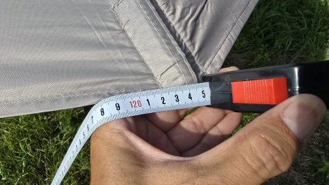 軒下長の実寸は約190cm。カタログ表記では200cmとなっているが軟らかい草むらでの設営で少し足が沈み込んでいるため少し低くなっているかもしれない。固めの地面で再度測定する予定。