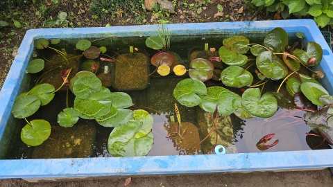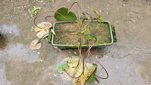 耐寒性睡蓮“ペリーズダブルイエロー”のスライド式植替を実施。