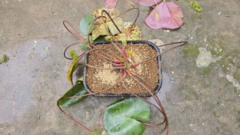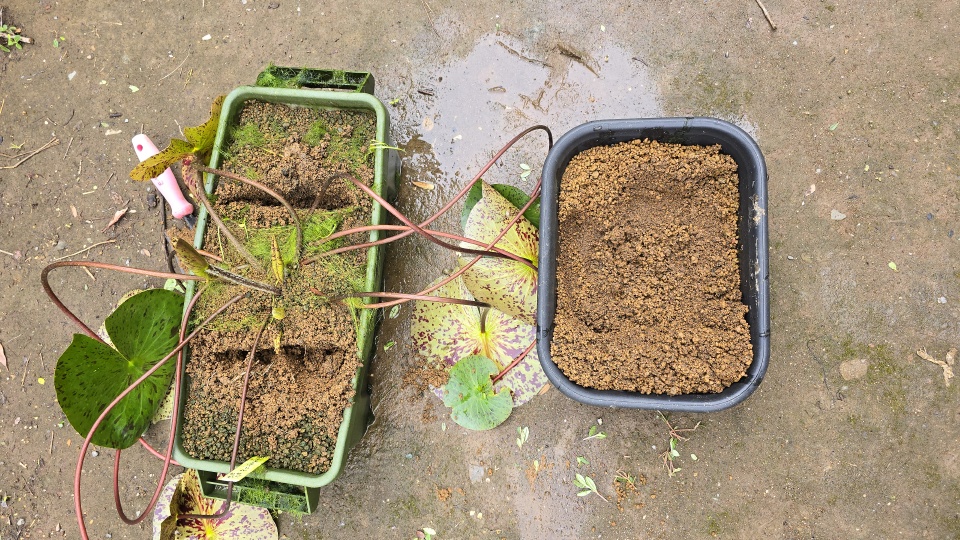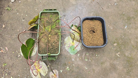 熱帯睡蓮“キングオブサイアム”の親株を抜いた[セリア/大鉢角型]を流用しスライド式植替を実施。