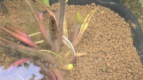 前季、見事な花形と鮮やかな黄色い大輪を咲かせてくれた耐寒性睡蓮“ペリーズダブルイエロー”であるがやはり根茎の伸長スピードが速く直ぐに容器がパンパンになってしまう。今回内鉢を[大和/ガレージコンテナ45型]から[セリア/大鉢角型]にサイズダウンしたことにより花上りに影響が出るかもしれないが注意深く観察していく予定。