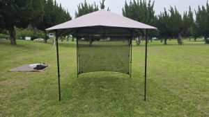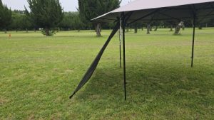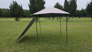 130cmの張り網経由で地面にペグダウンすることで風の抜けを保ったまま日除け&雨除けスペースを拡張することが出来る。夏の炎天下の際にはこのスタイルが良いと思われる。