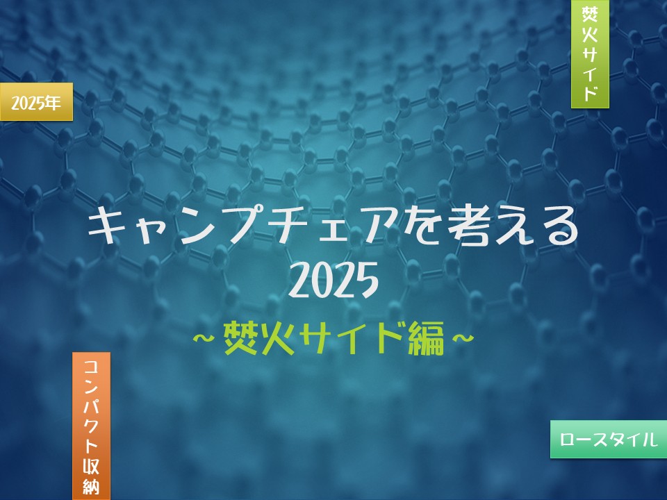 2025年からキャンプテーブル及びチェアをハイスタイルに変更し、腰と膝の負担が軽減され快適度がUP!反面、ハイチェアは焚火チェアとしては座面高が高く火床との距離があり暖を取り難い。ロースタイル時に焚火チェア[コールマン/ファイヤープレイス フォールディングチェア]を復活させるのも手だが、只でさえハイスタイル導入により圧迫されている車載状況を考えるとそれも厳しい。ということで、今回は車載を圧迫しない収納時のサイズがコンパクトとなる焚火チェアをあれこれ模索してみる。