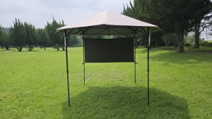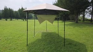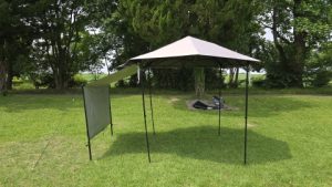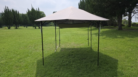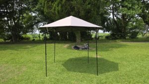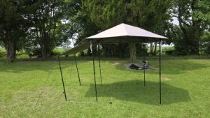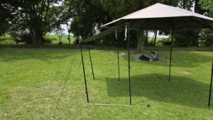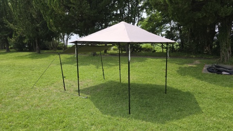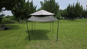 [SOLO UP/ワンアクションタープM-1424]を中段位(軒下高165cm/全高220cm)で展開。高段位に比べ明らかに脚フレームの安定度が高い。