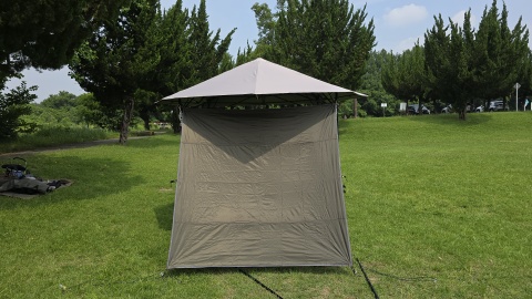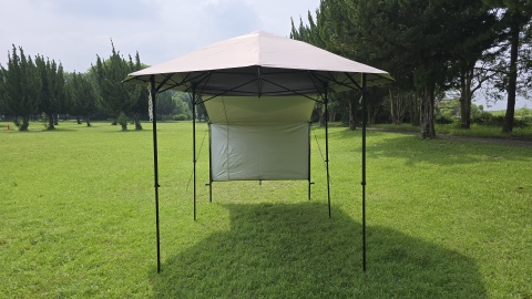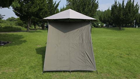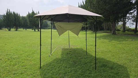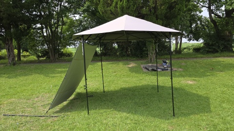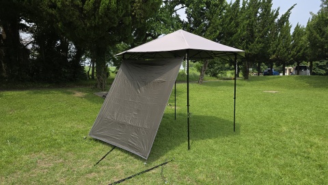 サイドウォール下辺を140cmポール*2と300cmガイロープ*2を使って立上げ。[SOLO UP/ワンアクションタープM-1424]の四隅のガイロープをペグダウンしていないこともあるが、自立式タープ本体がサイドウォール装着側に歪んでしまっている。サイドウォールをピン張りしようとすると更に歪みが顕著となる。また、サイドウォールの上に雨天時水が溜まることが予想され日除けならともかく雨除けとしては実使用に耐えないと考えられる。
