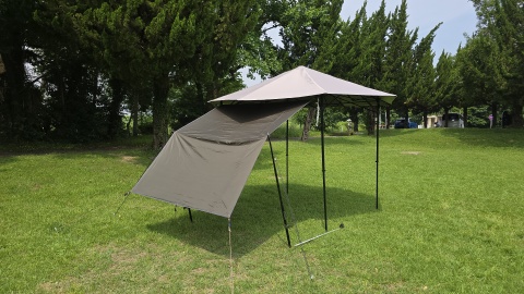 ポールの位置をサイドウォール中央に移動し、片翼を140cmポールにクリップ留め。上部空間に余裕のある雨除け&日除けスペースを拡張することが出来る。サイドウォール裏地のシルバーコーティングをプロジェクタスクリーンとして代替できるかも。