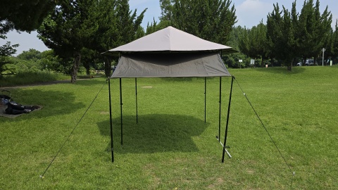 サイドウォールをポールで立ち上げる場合は[SOLO UP/ワンアクションタープM-1424]の上段位よりも中段位の方が本体フレームの安定度が高い。テントやミニバンと併用せず、単体で使用するなら中段位をベースとして方が耐風性が高いと考えられる。