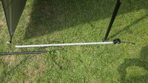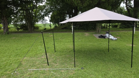 フッククリップを外し、サイドウォール下辺を140cmポール*2で立上げ。出入りも可能で雨除け&日除けスペースも拡張でき、自立式タープフレームへの負荷も少ないため実使用に耐えうると思われる。