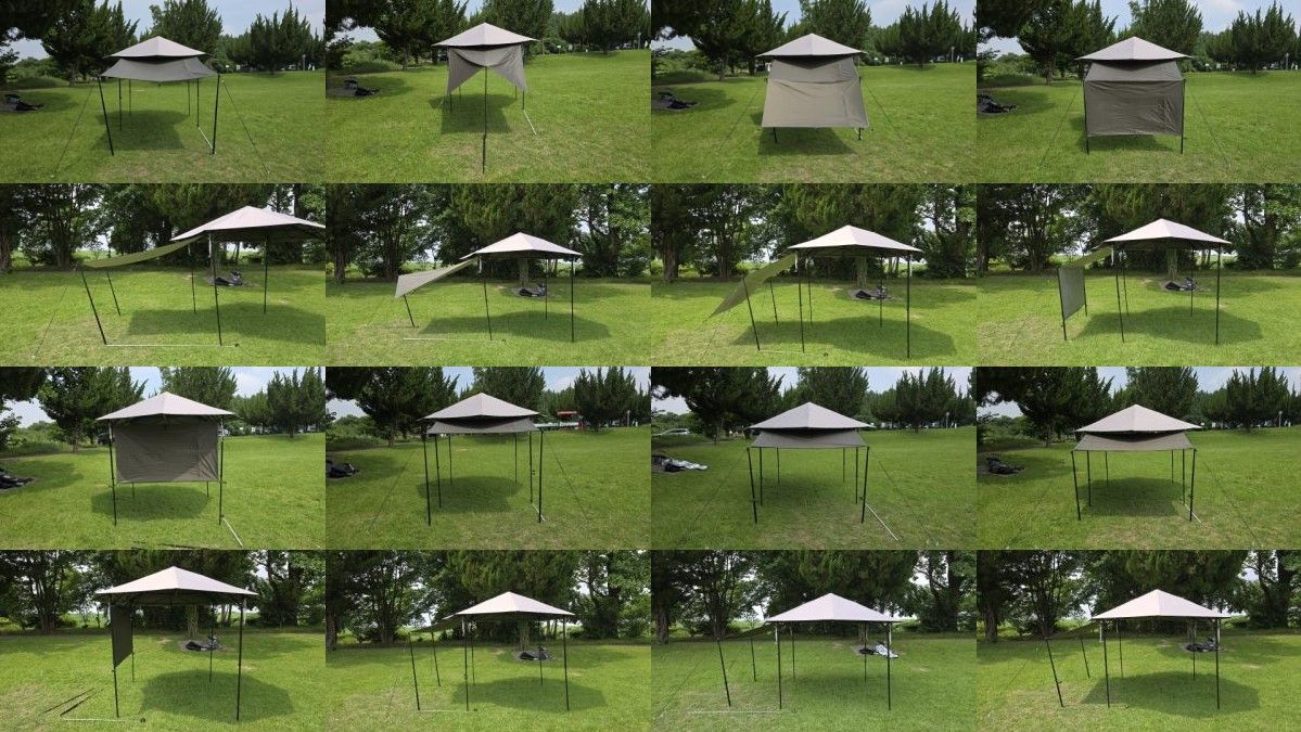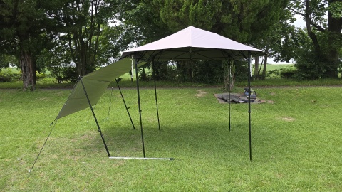 [Farfly/テントシート180*210]及び[Farfly/テントシート187*187]を1枚シートとしてポールを使って立ち上げると日除けスペースを広く拡張することが出来るが、雨天時に雨が溜まる可能性が高いこと、自立式タープのフレームへの負荷が高いこと、広い設営スペースが必要となることから実使用に耐えないと考えられる。
