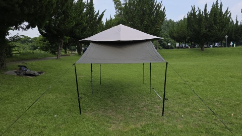 130cmポール*2で立上げ。自立式タープフレームへの負荷が高いこと、雨天時サイドウォールに水が溜まりそうなことを考えると実用度は低いと思われる。