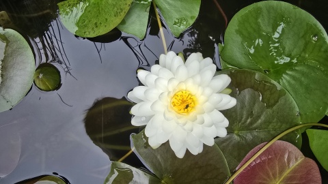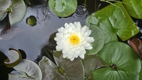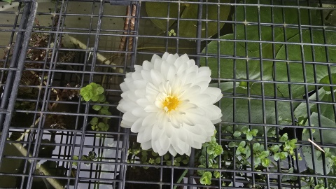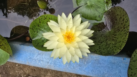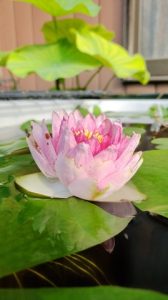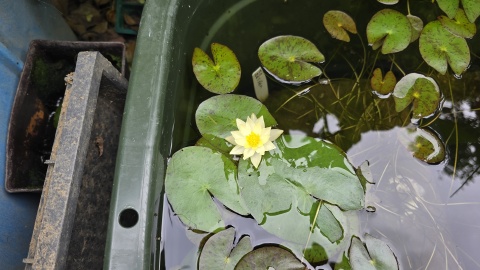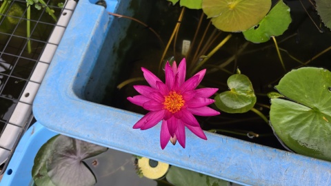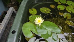 秋植替1季目の中型耐寒性睡蓮“タンポン”。今季導入初開花だが肉眼ではなく父親撮影画像での確認となる。次の花芽あり。