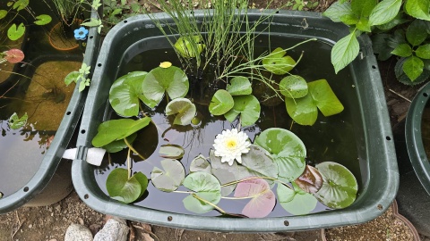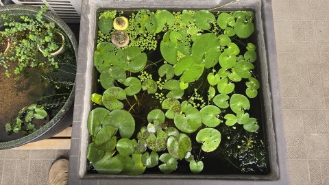譲り受けた耐寒性睡蓮“マニーサイアム”は狭い外鉢だったため浮葉が水面ではなく水上にまで展開している。睡蓮の浮葉が水上展開していることと外鉢の狭さは同義であるためサイズアップが好ましい。花芽も複数あるため近日中に開花見込み。