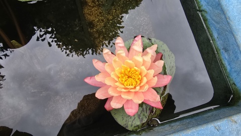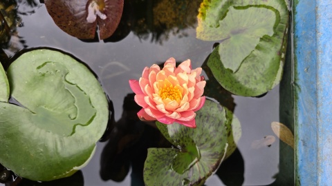 耐寒性睡蓮“グレッグスオレンジビューティー”今季初開花!花弁に皺が寄っているがオレンジとピンクのグラデーションが綺麗♪