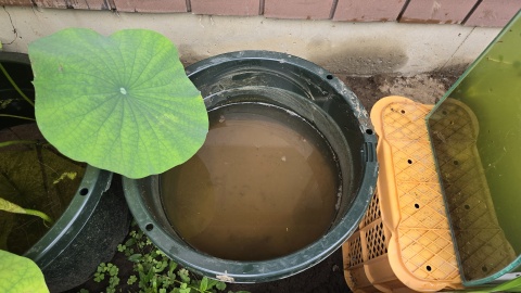 緑水化が酷い3鉢をフルリセット。耐寒性睡蓮“カビンブリ”を沈めてある南側ゾーンの[コメリ/トンボ角型タライ60型]。