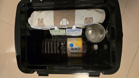 [ロゴス/氷点下パックL]2枚をタオルに巻き側面に立て掛け。ゼリー2個と2Lペットボトル1本、[STANLEY/スタッキング真空パイント 0.47L]1個を入れてみる。