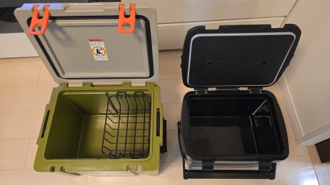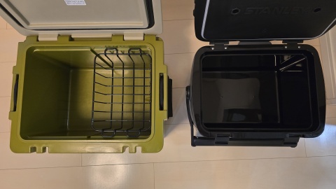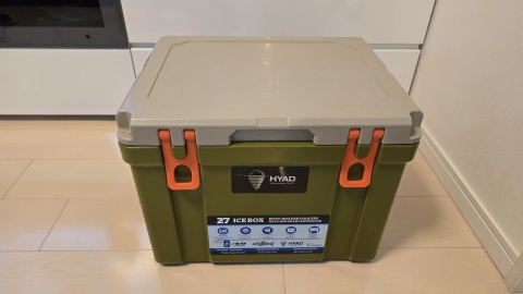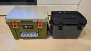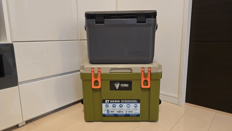 [Oregonian Camper/ヒャドクーラー27QT]との外観比較。仕様は容量25.5L/外寸48*36*24(h)cm/内寸37*26*26(h)cm/重量5.5kg。スクエアボックス型で見た目がすっくりしている。高密度ポリエチレン断熱材を採用し、3~5日間の保冷力を維持となっているが、昨今の猛暑下では保冷力は半分以下まで落ちる印象あり。
