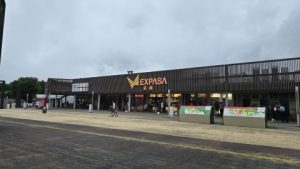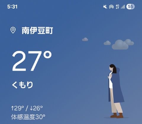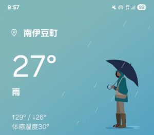 10時チェックアウト。車温度計は30℃、スマホ現在地気温は27℃。