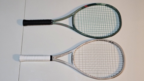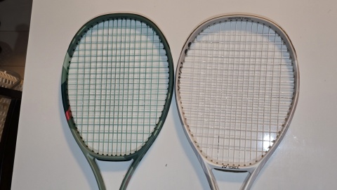 [YONEX/Vコア100]と[YONEX/パーセプト100]の外観比較。フェイスサイズは同じ100ichだが[YONEX/Vコア100]の方がやや縦長。