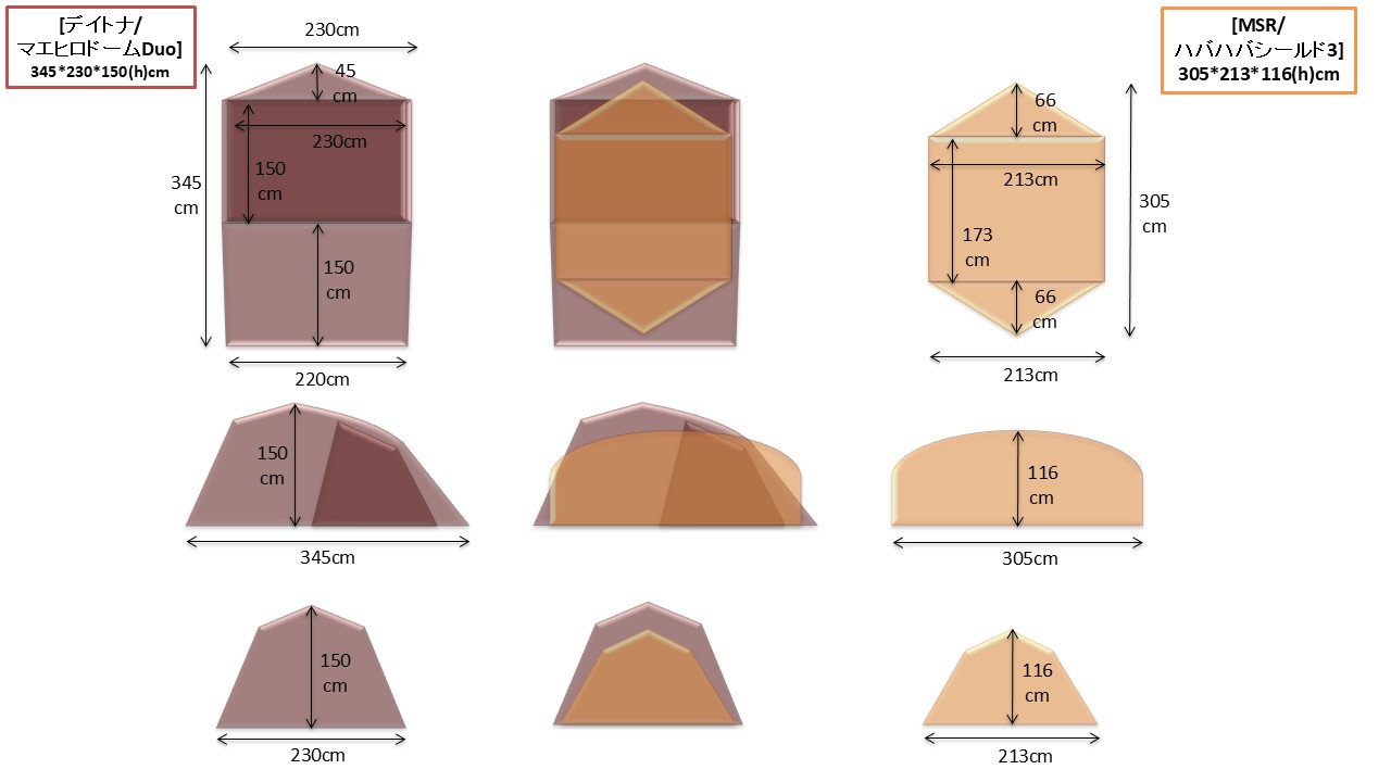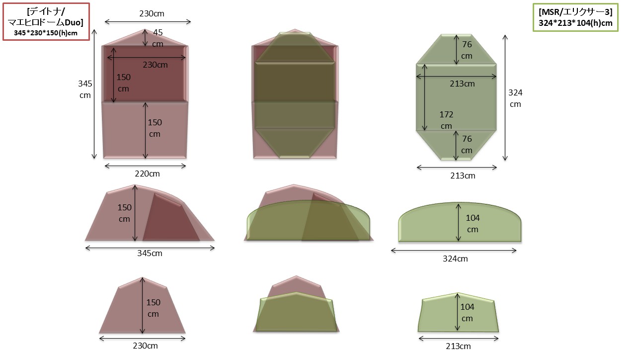 [MSR/エリクサー3]は山岳用1ルームテントで、最大使用人数が3人なのでインナーサイズは[DAYTONA/マエヒロドームDuo]より大きく、やや広めの前室があり、全幅も同程度だが全高が-46cm低い。