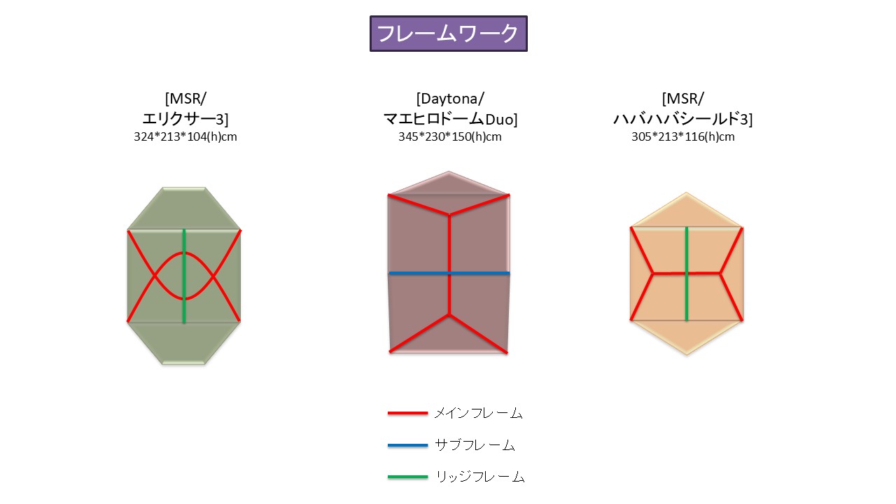 [DAYTONA/マエヒロドームDuo]はダブルY字フレームをセットしアーチポールを長辺側に組み込むフレームワークで幕壁の角度を垂直に近づけることが可能で幕内のデッドスペースが少ない。[MSR/ハバハバシールド3]はアーチポールがリッジポールに変わっただけでフレーワーク自体は同じで設営行程と幕内空間を両立する優秀で個人的にも好み。[MSR/エリクサー3]は魚座型フレームワークにリッジポールを追加する構造で魚座型のフレームワークは独特なので最初は戸惑うかもしれない。
