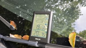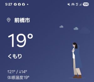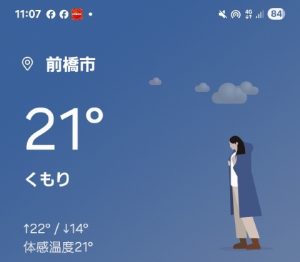 11時頃の車温度計は18℃、幕内外気温は20℃、スマホ現在地気温は21℃。