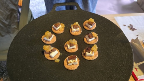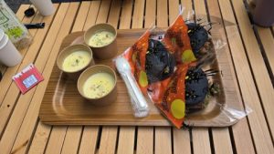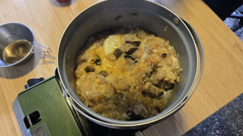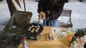 我家の朝食は前日のの炊き込みご飯を使った雑炊。KMさん宅はキャンプ場に事前申し込みしておいたモーニングセット。デザートは娘お手製チョコマシュマロレシピ♪