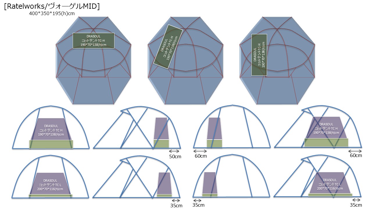 ソロオコモリ幕として使用する際のインナーは[DRASOUL/コットテントTC]のハイコット仕様を想定。ハイコットにすると幕内ベンチ使用ができるのとコット下を荷物置き場として使えるのが利点だが、半面幕壁から少し離してレイアウトする必要がありデッドスペースが生じる。[Ratelworks/ヴォ―ゲルMID]は後面からの出入りが出来ないことを考えるとコットテントは奥側にレイアウトするのが良いと思われるが、幕壁にどれくらい寄せることが出来るかで場合に寄っては斜めもしくは左側にレイアウトすることも選択肢に入る。