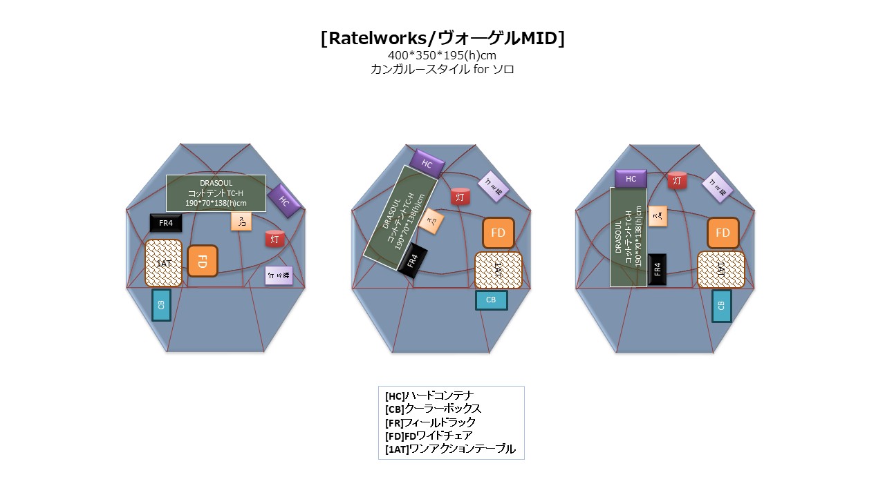 幕内レイアウトイメージを3パターン思案してみた。クーラーボックス以外はフライドア/メッシュドアの仕切りの奥にレイアウト。実際には幕壁にどれくらい寄せることが出来るか否かでレイアウトを変更する必要が出てくると思われる。