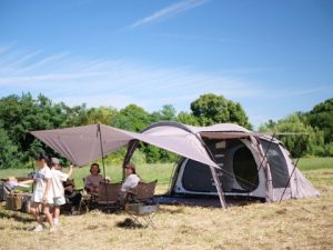 外寸650*330*200(h)cm/収納寸80*35*35(h)cm/インナー寸305*245*185(h)cm/重量17kg。アーチフレームをベースとしたファミキャン向けの大型2ルームテント。