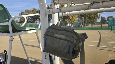 [HERO CLIP/ヒーロークリップ MINI]はテニス周りだとややサイズが小さく引っ掛ける箇所が限られる。