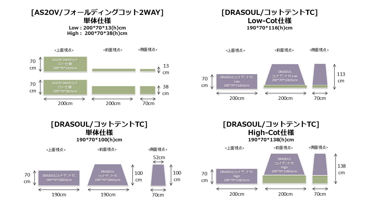 [DRASOUL/コットテントTC]3種は基本[AS2OV/フォールディングコット2WAY]に装着しハイコット仕様で使用。ハイコット仕様にすると上部がテント幕内壁に干渉し端に寄せることが出来なくなるが、幕内でインナーテントとして使用する場合にベンチとしても使用することが出来るのとコット下を荷物スペースとして使えるので便利♪
