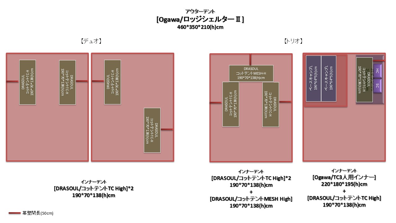 ハイコット仕様の[DRASOUL/コットテントTC]は高さが138cmありロッジシェルターⅡとの幕壁と干渉するため約50cm空ける必要がある。以下イメージ図は幕壁間長を50cmと想定して各種インナーテントをレイアウト。ローコット仕様にすれば幕壁間を短くすることが出来るがベンチ使用が出来なくなることに加え、コット下の荷物スペースも設けることが出来ない。