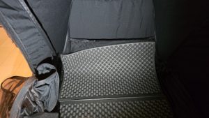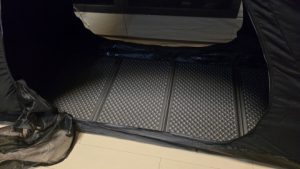 200*120*1.5(h)cmの[Ogawa/フォームマット2]を二つ折りサイズ200*60*3(h)cmで幕内に配置。[DRASOUL/コットテントTC]のフロアサイズは190*70cmで奥行はセットできるが全幅が10cm長くジャストレイアウトは出来ない。使用自体は可能だが実際にキャンプ市で使用する際は183*51*2(h)cmの[THERMAREST/Zライト レギュラー]に代替した方が良いかな。