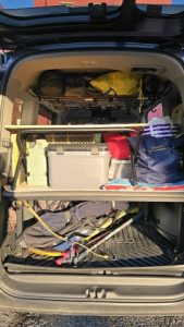 車内は不慮の休憩を案じて半面ベッドキット仕様。車載量は前シーズン使わなかったキャンプ用品を精査したこともあり余裕あり。