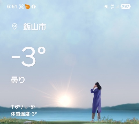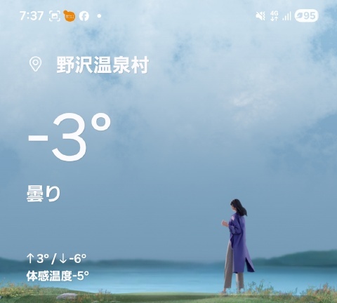 7時半頃の車温度計は-3℃、スマホ現在地気温も-3℃。