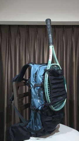 テニスラケット1本をマウント。ヘルメットアタッチメントでマウントした位置より低くなり実用性あり。